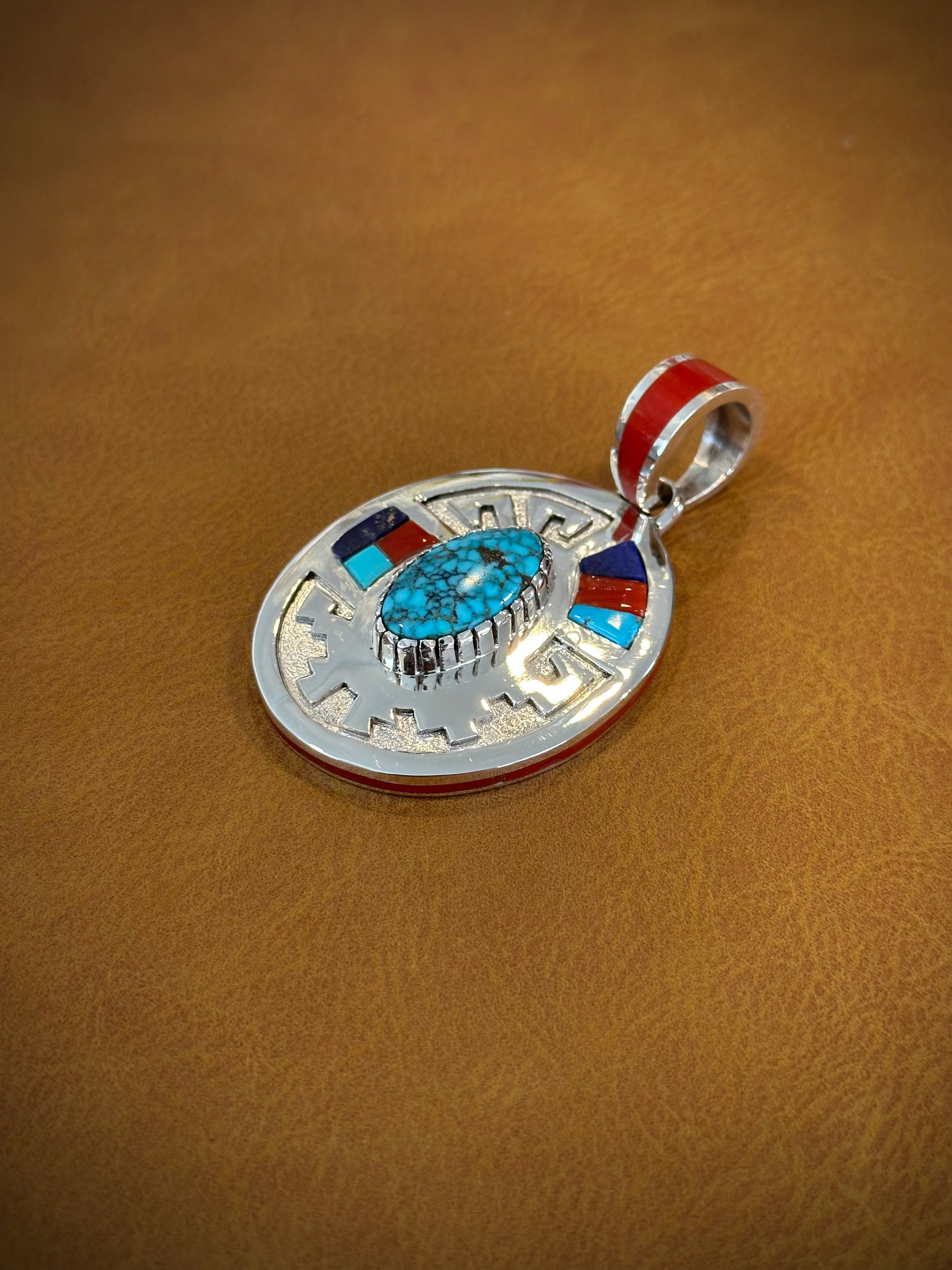 This Kingman pendant is a stunning piece, intricately designed with cutouts and inlaid with genuine turquoise, coral, and lapis stones. Made from high-quality sterling silver, it combines elegant beauty with expert craftsmanship. Elevate any outfit with this unique and timeless accessory.